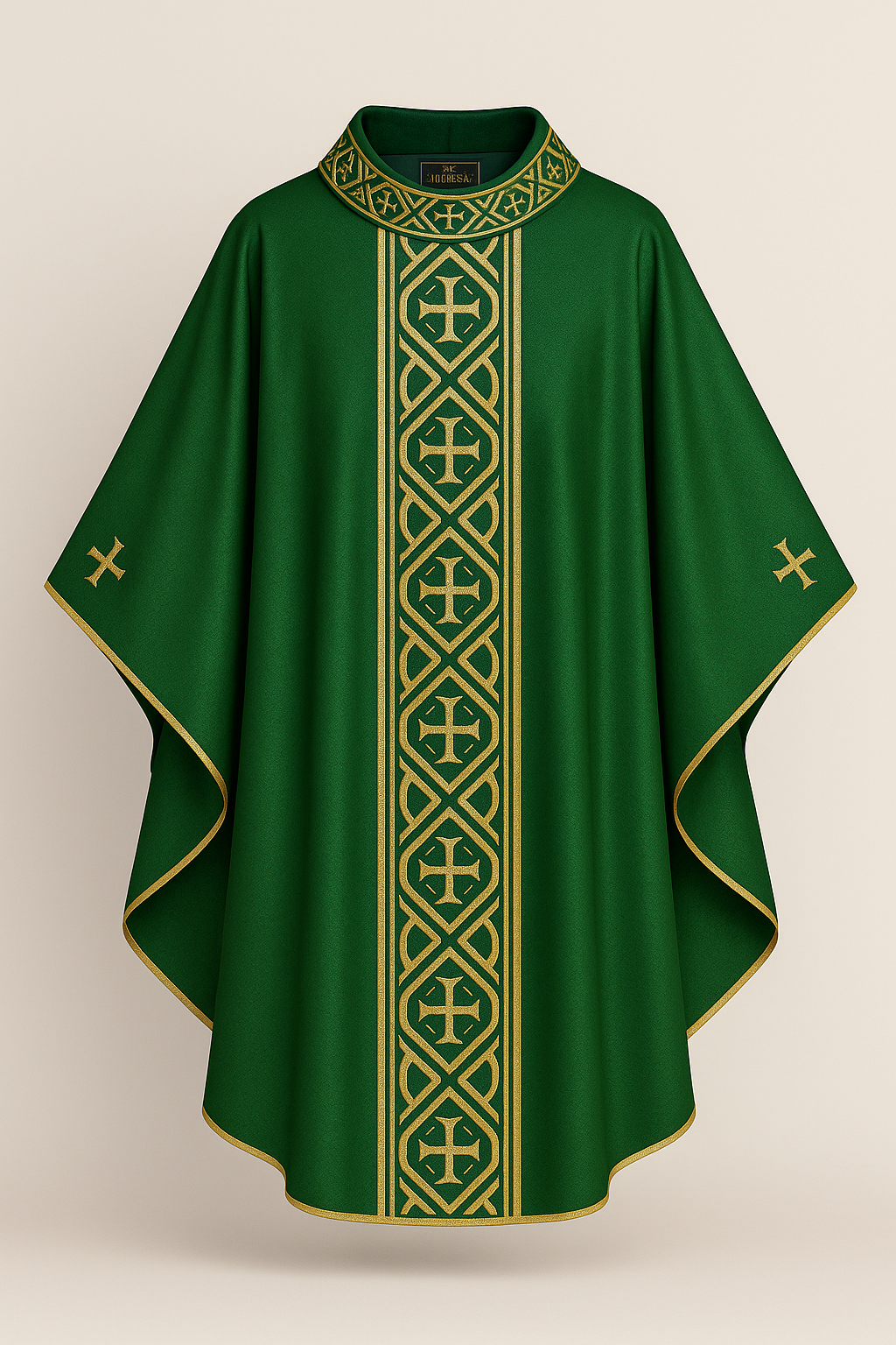 Casula confeccionada em tecido Gabardine de alta qualidade, com caimento leve e toque sofisticado. O galão central é composto por bordados, proporcionando destaque e elegância à peça. Toda a casula é ricamente bordada com detalhes litúrgicos, expressando solenidade e reverência. Ideal para celebrações especiais, une tradição, beleza e excelência artesanal.